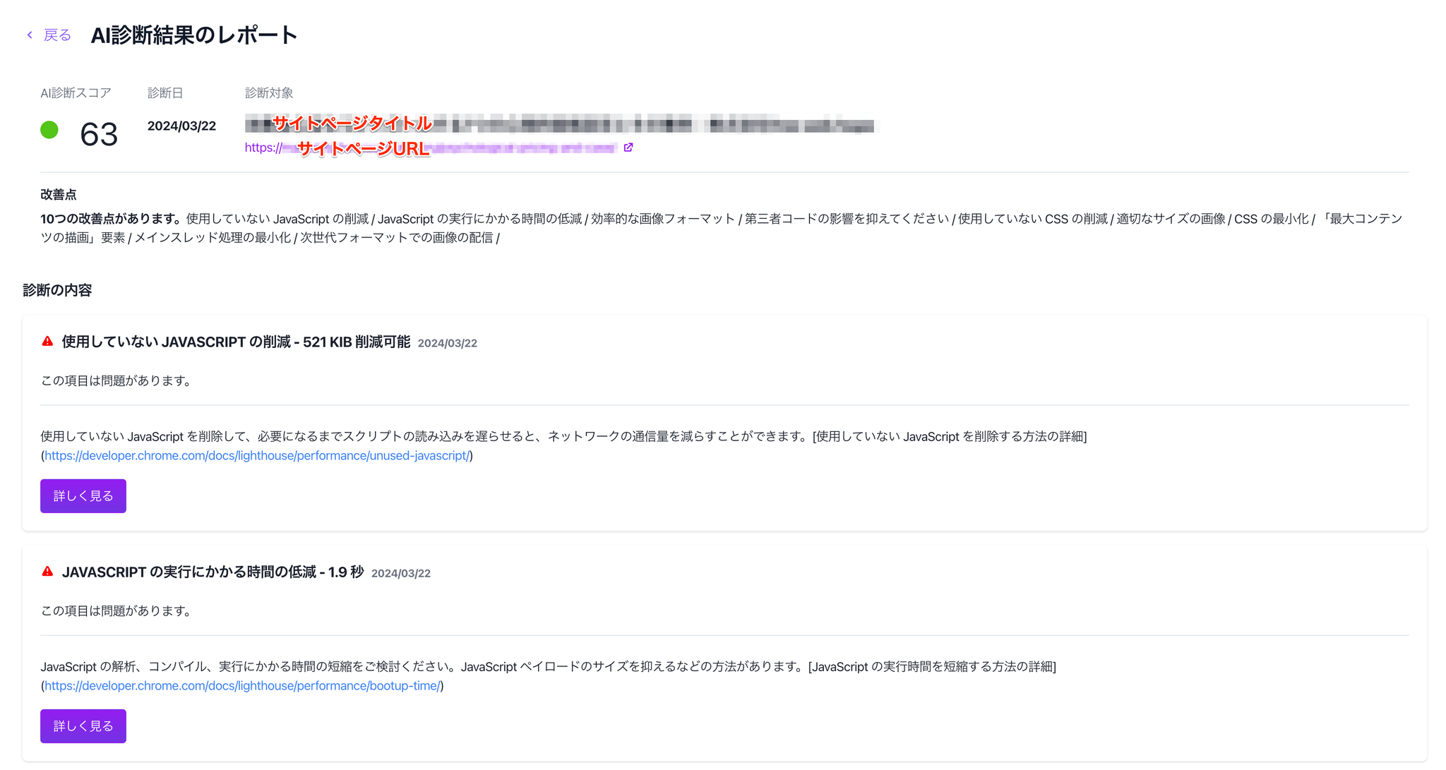 「AI診断」では、ページスピードインサイトをもとにAIでAI診断スコアを算出します。
