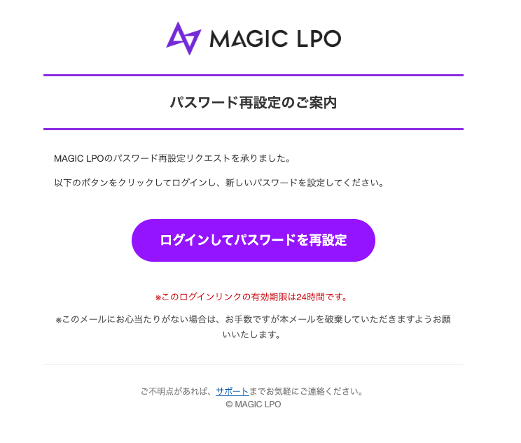 ログインができなかった場合は、ステップ3で届いたメールをすでに1度クリックしてしまったか、有効期限が切れている可能性があります。再度ステップ1からお試し頂いた後、ログインができない場合は、Magic LPO サポートまでお問い合わせください。