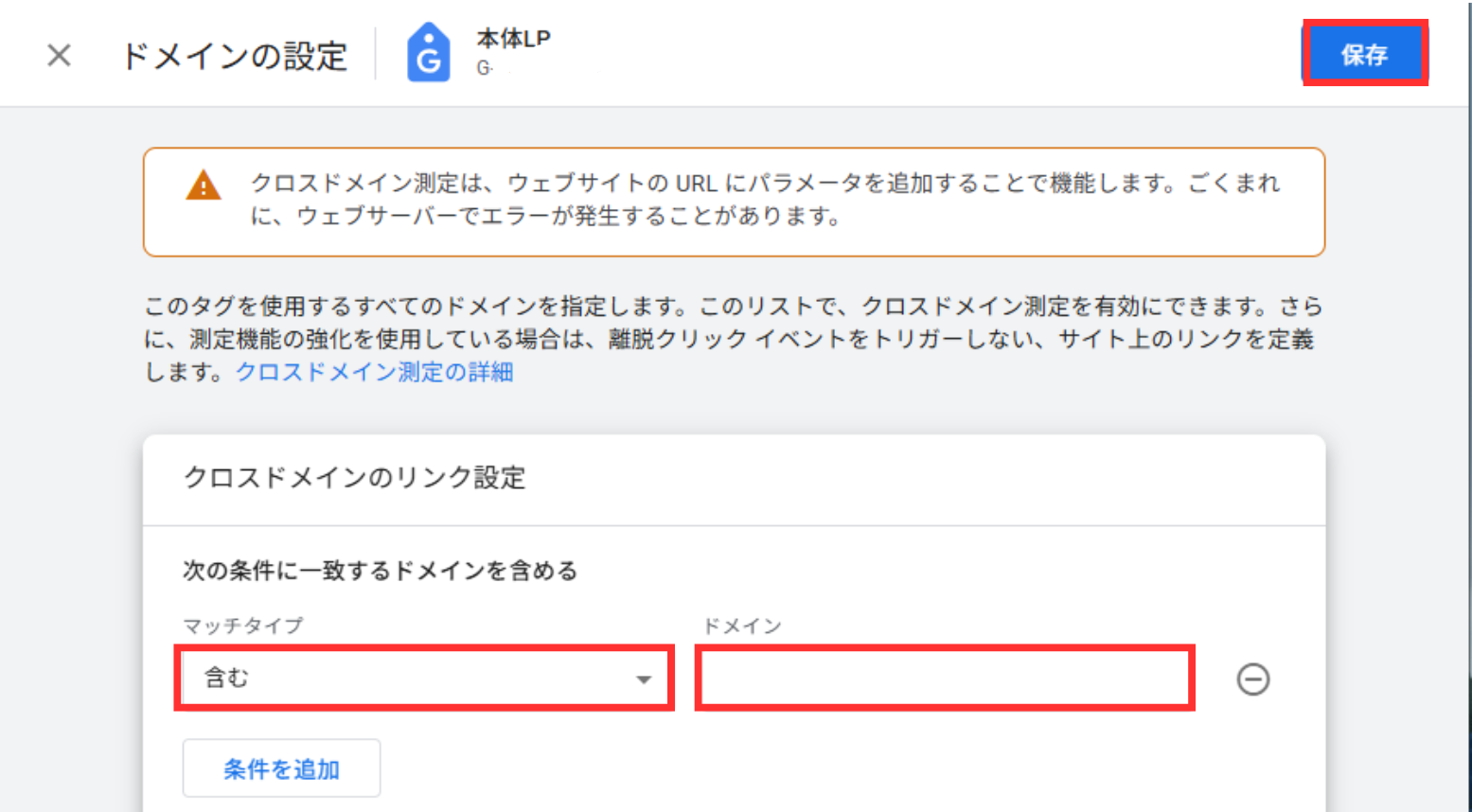 5.クロスドメインのリンク設定をします。「マッチタイプ」を「含む」に選択し、「ドメイン」に使用しているドメインURLをすべて記入してください。その後、「保存」をクリックしたら完了です。