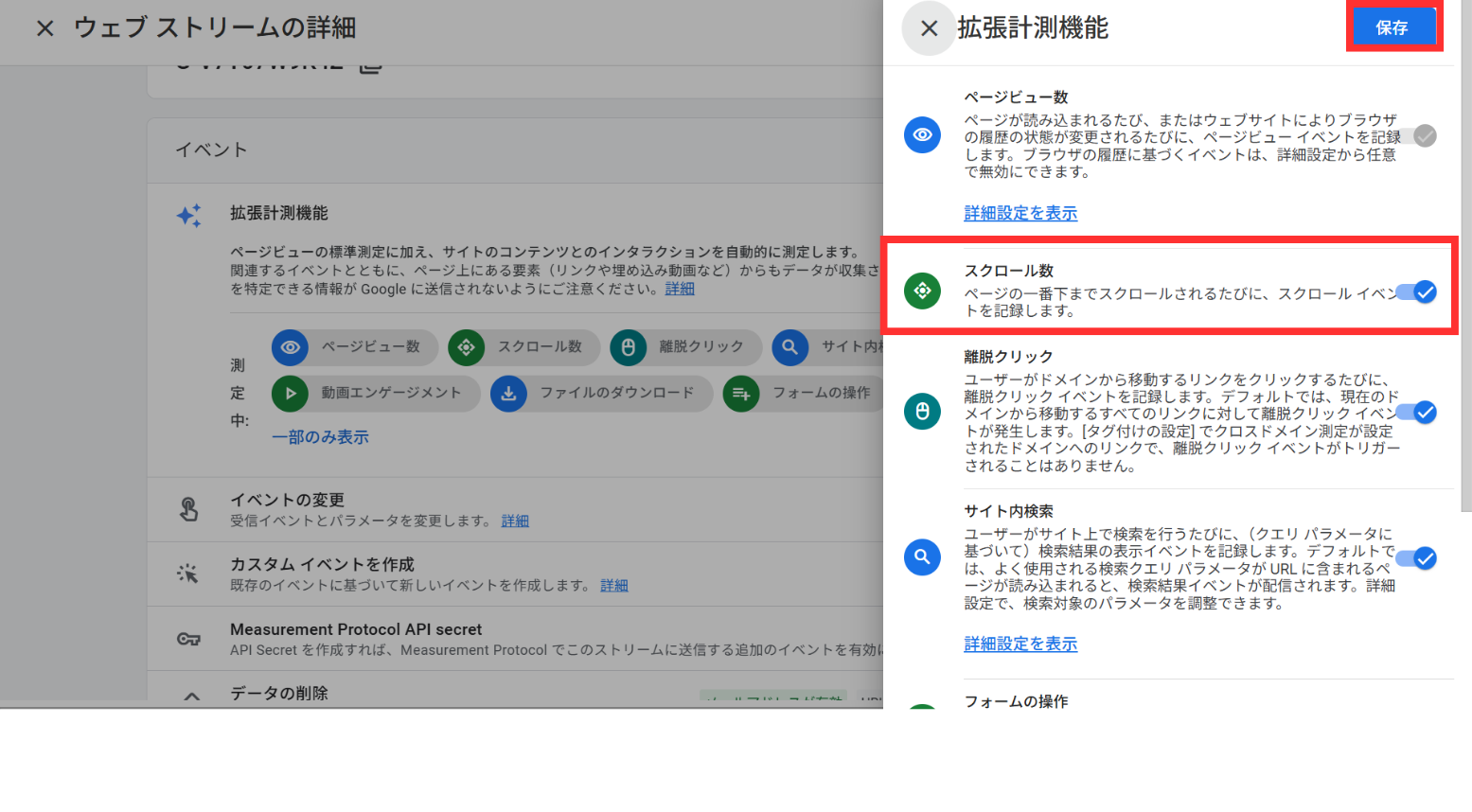 2.「ウェブストリームの詳細」の中の「拡張計測機能」をクリックし、スクロール数がオンになっていることを確認します。