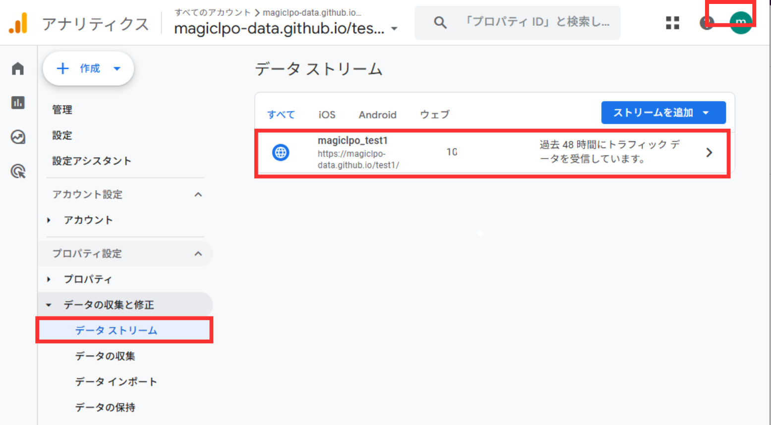 - 「管理」>「データストリーム」をクリックします。