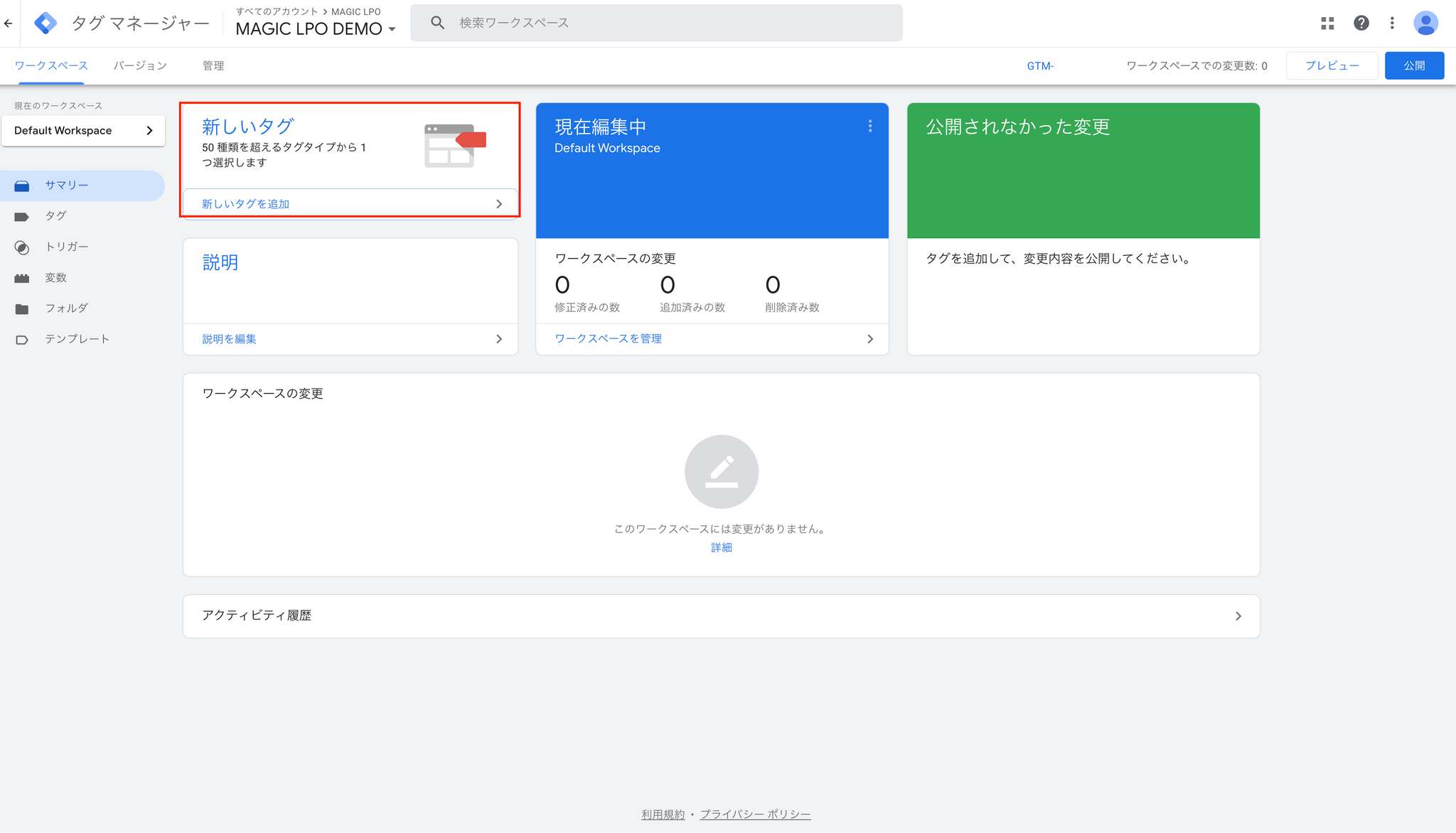 Google タグマネジャーで行った変更を管理するためのものです。タグの変更(削除・作成)を含んだバージョンを「公開」すれば、タグで設定した内容がWebサイトやWebツールに反映されます。