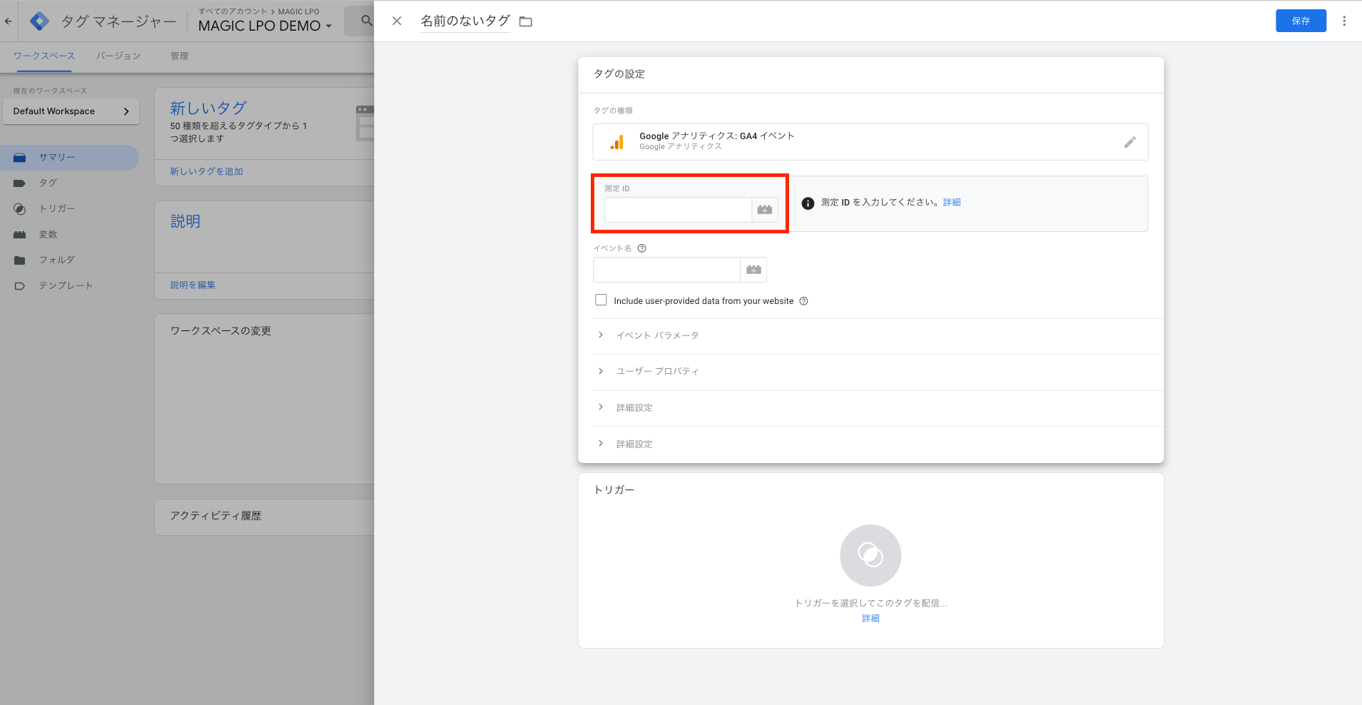 トリガーではタグで設定した内容を発火(実行)するタイミングを決めることができます。よって、トリガーを設定していない状態では、タグを発火することはできません。